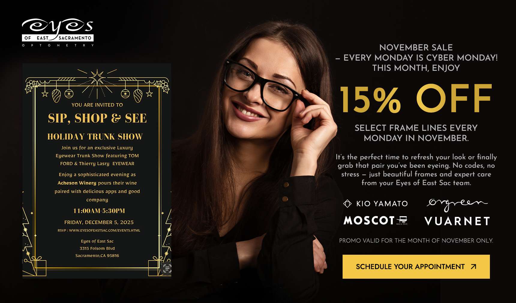We pride ourselves on the best selection of frames in the greater Sacramento area! We curate well crafted fashion-forward, durable eyewear. Our amazing opticians are here for you to make eyewear selection less daunting. We will make sure your frames fit your face shape and will work with your specific glasses prescription. Glasses are more than a medical device, they are like a piece of jewelry for your face! We believe that you should love the way you see AND look. You can stop in any time we are open without an appointment to be fitted!